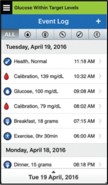 In the system Event Log (Menu → Event Log), the value and time of your most recent blood glucose calibration will be listed, and will be indicated by a red blood drop icon. If helpful, you can sort for only blood glucose entry events by tapping on the blood drop icon in the sort bar at the top of the screen.