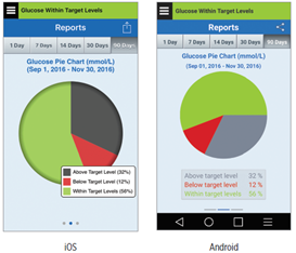 The Glucose Pie Chart report shows in graphical format what percent of your readings within a given time period are within, below or above your Glucose Target levels. You can choose the last 1, 7, 14, 30 or 90 days.