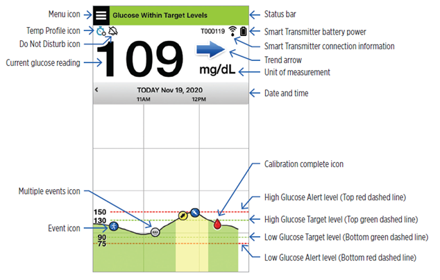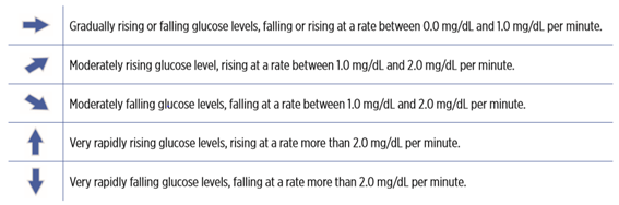 The arrows on the screen are called “Trend Arrows”. The trend arrow shows the current direction the glucose is going and how fast the glucose trend is changing.